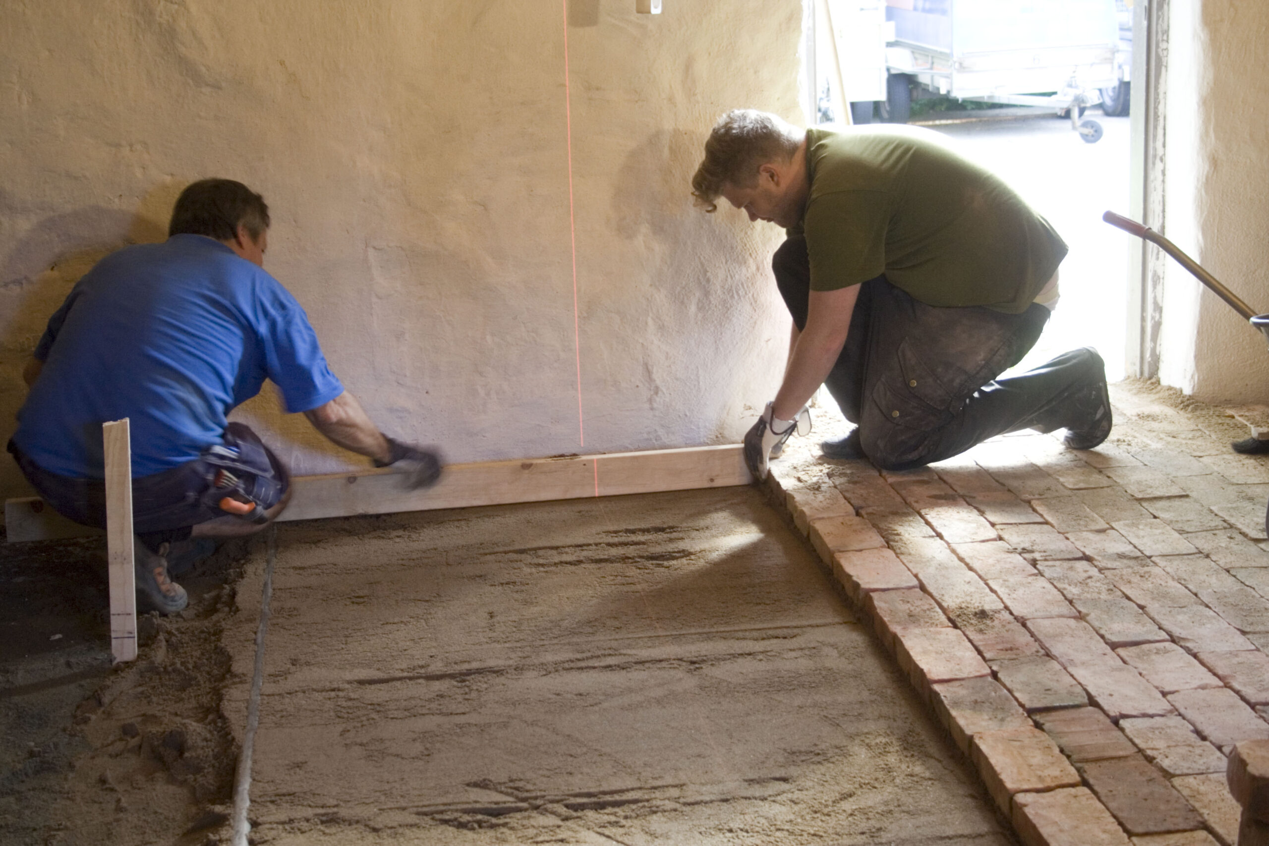 Byggnadsantikvarie Ekberg och ingenjör Hesterman lägger teglegolv med millimeter passning.